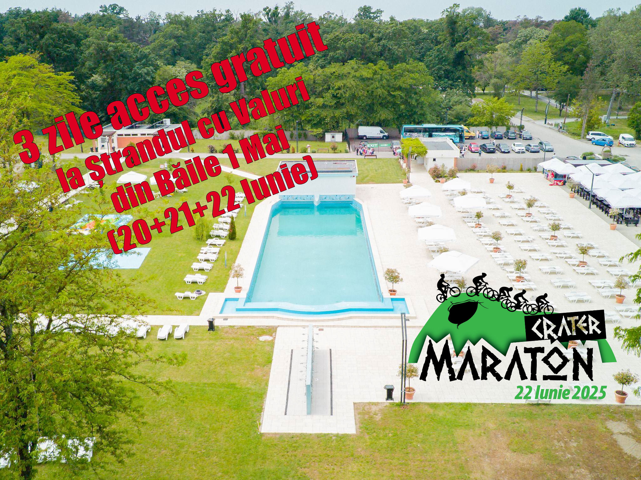 Cei care figurează în lista celor înscrişi pentru Crater Maraton 2025 pe site şi confirmă participarea prin achitarea taxei de participare până în 17 Iunie vor avea acces gratuit în zilele de 20+21+22 Iunie 2025 la Ştrandul cu Valuri din Băile 1 Mai (accesul se va face pe baza actului de identitate şi pe baza listei de participanţi on-line!).